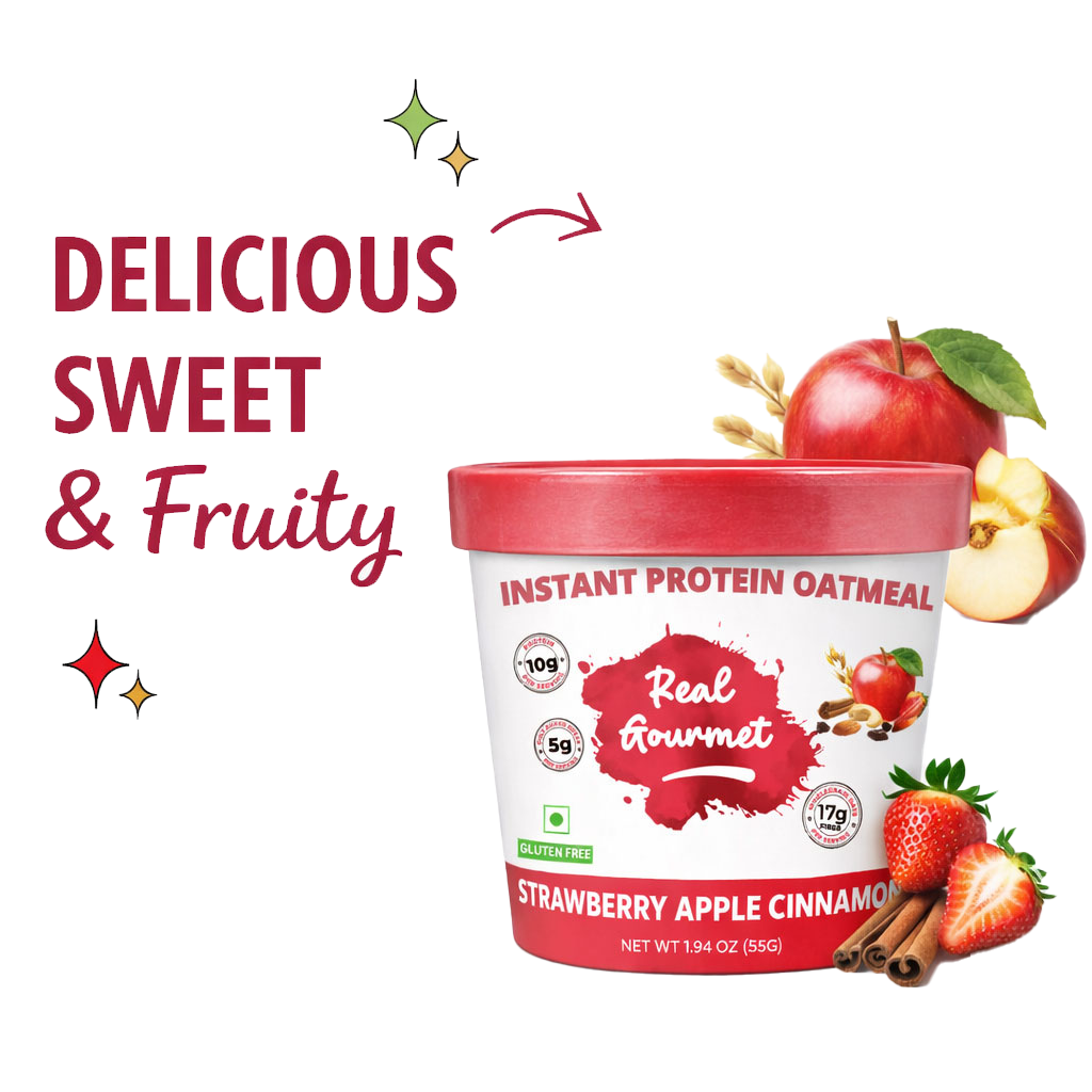 Enjoy the perfect balance of sweet strawberries, crisp apple, and warm cinnamon in every spoon. Real Gourmet Instant Protein Oatmeal is crafted to give you nutrition, taste, and convenience—all in just minutes.
